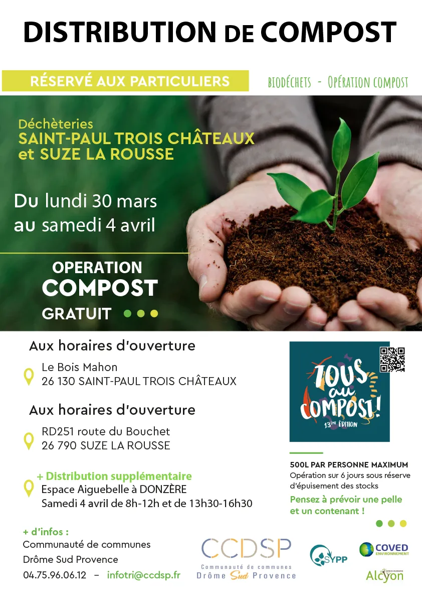 Le SYPP, en lien avec la CCDSP, organise 2 fois par an une distribution gratuite de compost. Celles-ci ont lieu au printemps et à l’automne (dates variables).