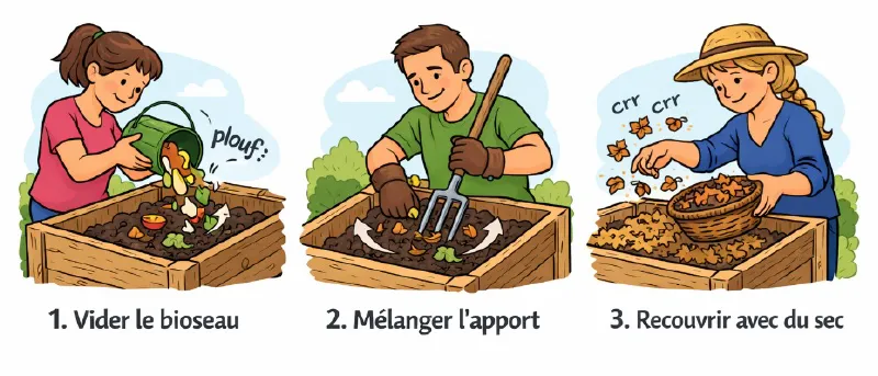 - Étaler et mélanger l’apport avec les déchets déjà présents