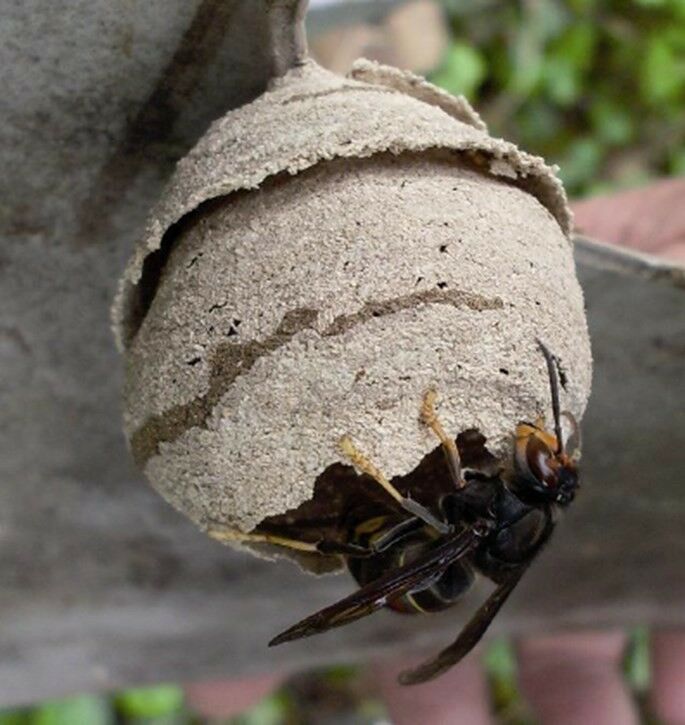 Le frelon asiatique fait deux nids bien distincts dans l’année. Un premier entre mars et juin, que nous appelons nid primaire. Il est petit, est construit par la reine quand elle fonde sa colonie et n’abrite que quelques ouvrières et larves.