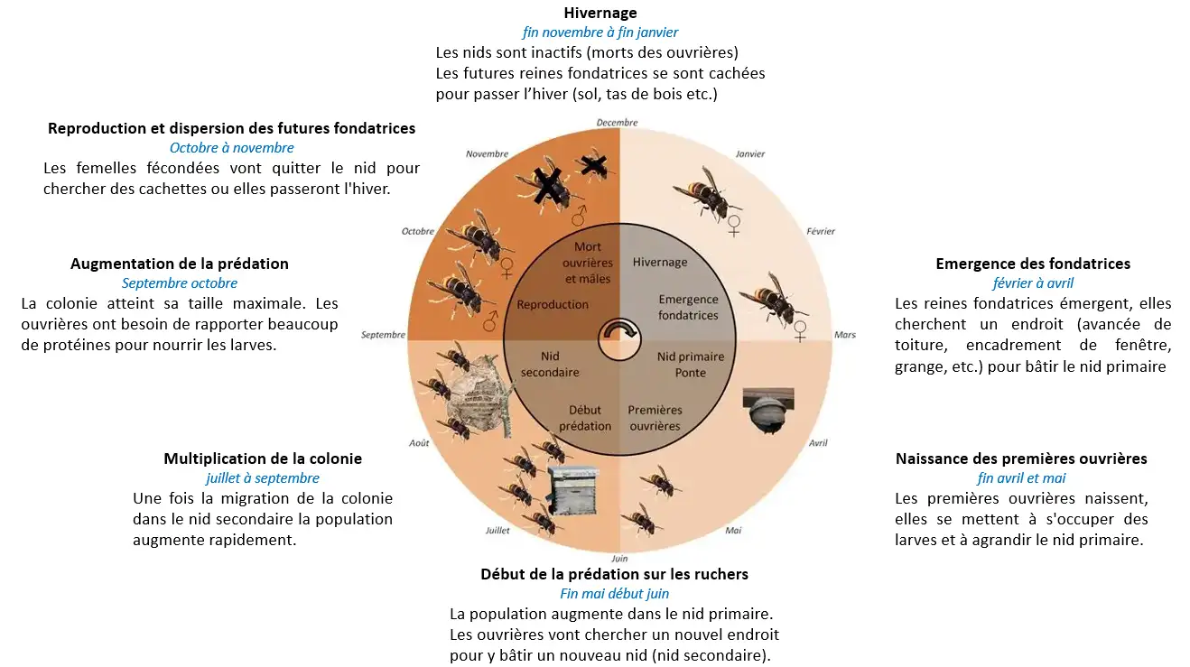 Le frelon asiatique (reines, ouvrières et mâles) ne vit qu’un an et seules les futures reines passent l’hiver. Le schéma, ci-dessous, vous présente le cycle de vie du frelon asiatique (Source : INRA, K. Monceau, D. Thiéry).