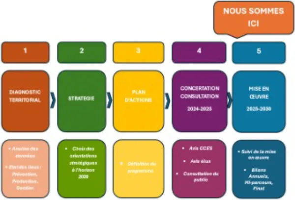 Le PLPDMA fixe une stratégie de réduction des déchets à la source sur 6 ans. Il s’appuie sur un diagnostic détaillé du territoire (habitants, entreprises, production de déchets, gestion existante…) et définit :
