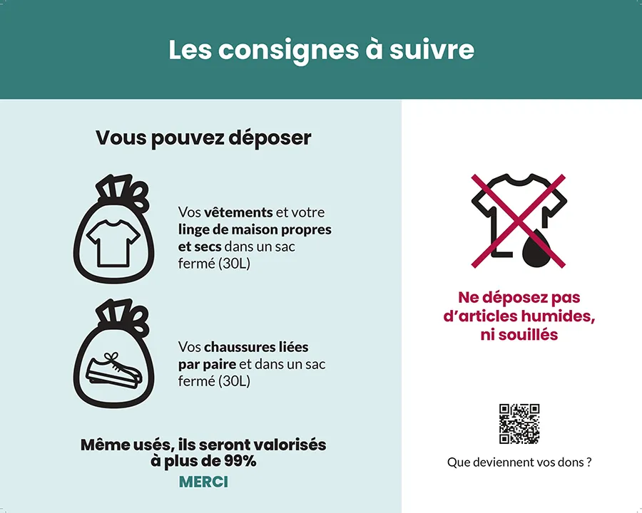 Tous les textiles d'habillement, linge de maison et chaussures usagés peuvent être rapportés, quel que soit leur état, même abîmés. Ils doivent être placés propres et secs, les chaussures liées par paire, dans des sacs fermés.